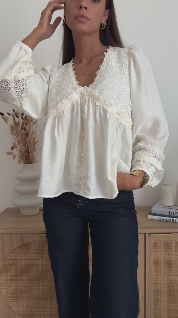 - Blusa scollo a V con corpetto in pizzo con motivi floreali