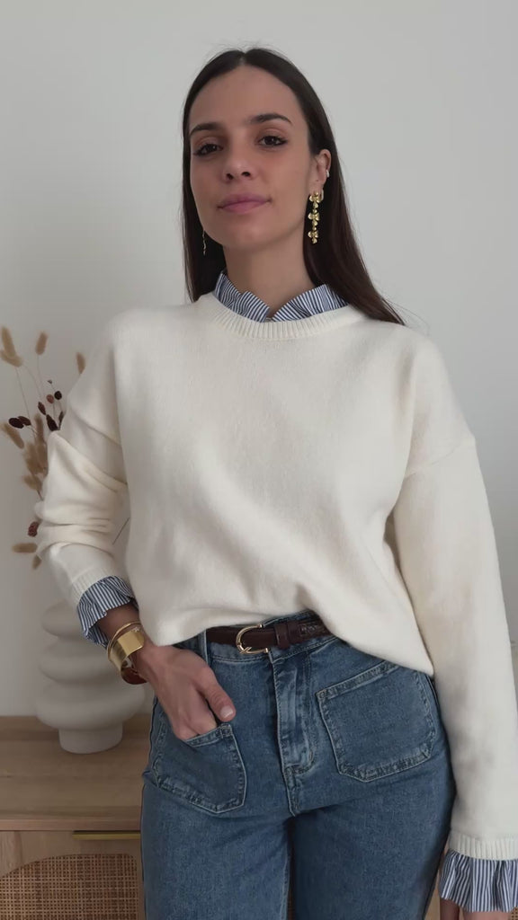 - Girocollo con dettaglio in camicia integrata su collo e polsini